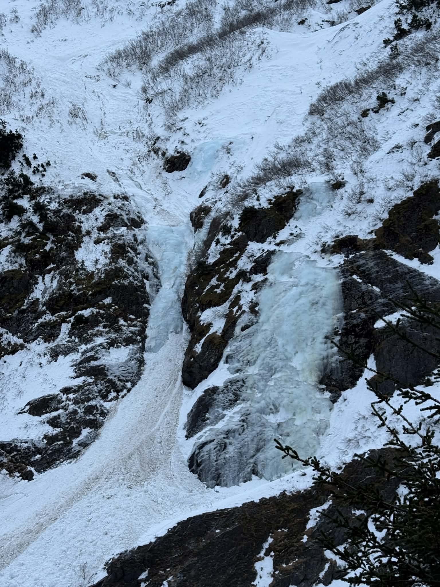 This is the first climb on the left, near the canyon mouth. It derives its name from the huge avalanches that are hurled down it all winter. The climb is moderately angled for most of its length, there is however a short and somewhat steep curtain at the top of the climb. This route is safe in early season when a cold snap occurs before a snowfall.