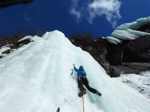 Kirsten Kremer: Bridal-veil and Greensteps in Keystone canyon. These were and are my training grounds. It’s where I learned to climb and where I continue to climb to get and assess my fitness. I can still see and hear BT encouraging me to lead the first pitch of Bridal-veil when we met in 1994. Old screws, my ski clothes, knee pads, goggles overheating, straight shafts, leashes, footings and BT’s, “You can do it” mantra. Bridal-veil holds so many memories. Steve Garvey on the killer pillar telling his belayer, “There’s a time to whine and a time to climb. Pay attention, you got a man on the line.” This is where you watched the masters from the car. Garvey, Sweeney, Tobin, Comstock, BT and more honing their big mountain skills on the roadside. I remember trying to show off for my partners, Gabe Lydic and Johnny Soderstrom by leading the left side of the killer pillar that went into an overhang. I thought I was strong, but when I came to the defining move to surmount the overhang, there was a one inch crack separating the pillar. I would either have to hook tor make a move above it. My heart rate accelerated as did my pump. My left arm ricocheted off the ice over and over. Finally, I thought it was good enough. I weighted it and tried to move my feet up and it popped. My last screw was in shitty white ice in the cave below and it ripped out. I sailed down stretching the ropes to land next to my belayers. “I think I’ll just go around the other way,” I said as I ate my humble pie. Greensteps would hold a bouquet of memories as well. Belaying BT as he gracefully glided up Roman’s pillar when it was exceptionally slim and being mesmerized by the beauty of the ice caves. When I was leading it in the cold morning to set ropes for The Ice Pixies Ice Fest, I got my pick stuck and struggled to get it out. Pulling and pulling until I finally got it out right into my face. I finished the lead and came down with a bloody face. I had to wash it with Natty Ice beer since that was all I brought.